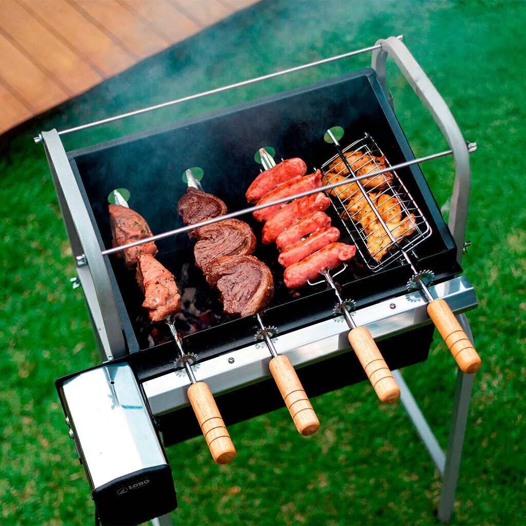 A Churrasqueira Canadense é portátil com 4 espetos giratórios e braseiro para carvão em duas opções possíveis, alumínio ou inox. Fabricada em aço carbono e pintura eletrostática para maior proteção da sua churrasqueira.